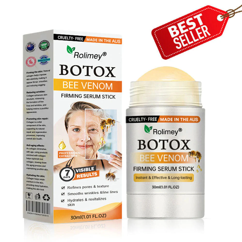 The Rolimey® Botox Bee Venom Firming Serum Stick is an effective solution for diminishing visible signs of aging and wrinkles, resulting in a rejuvenated skin appearance within a span of 3-5 weeks. This cream incorporates scientifically proven ingredients like Sapphire-Infused Triple Peptide, Tri-Hyaluronic Acid and Micro Algae which effectively combat wrinkles and promote skin vitality.