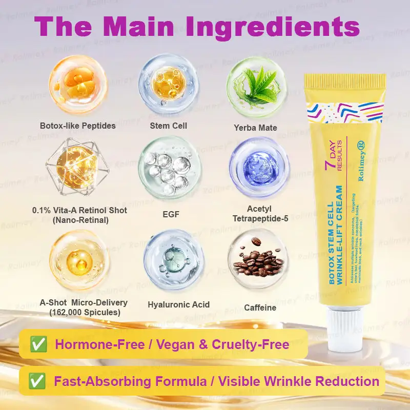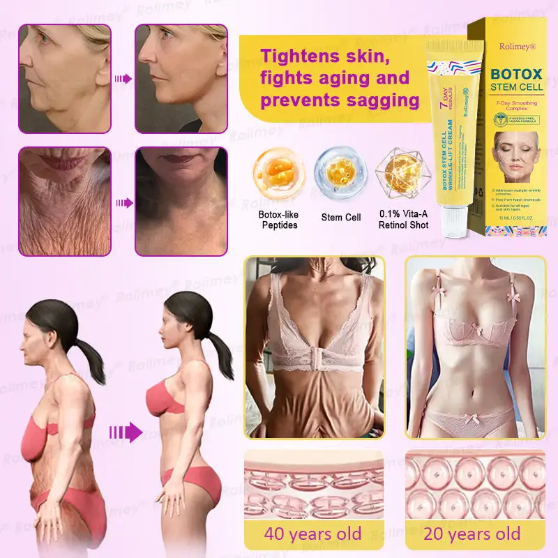 Rolimey® Botox Stem Cell Retinol Wrinkle-Lift Cream is designed to smooth, firm, and visibly lift aging skin on the neck, chest, and face