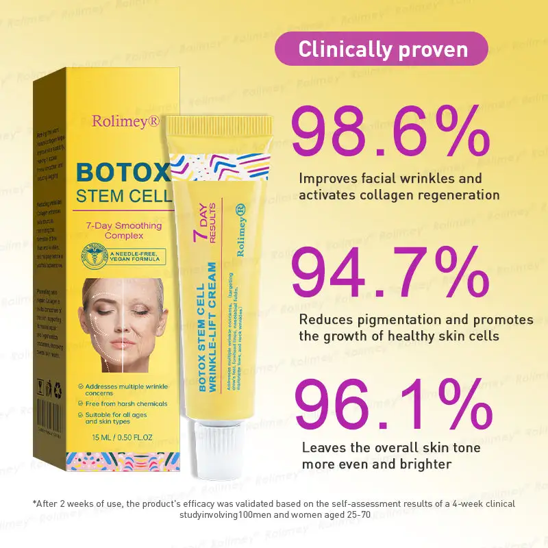 Clinically tested by dermatologists, Rolimey® Botox Stem Cell Retinol Cream helps visibly smooth wrinkles and improve skin firmness in as little as 7 days.
